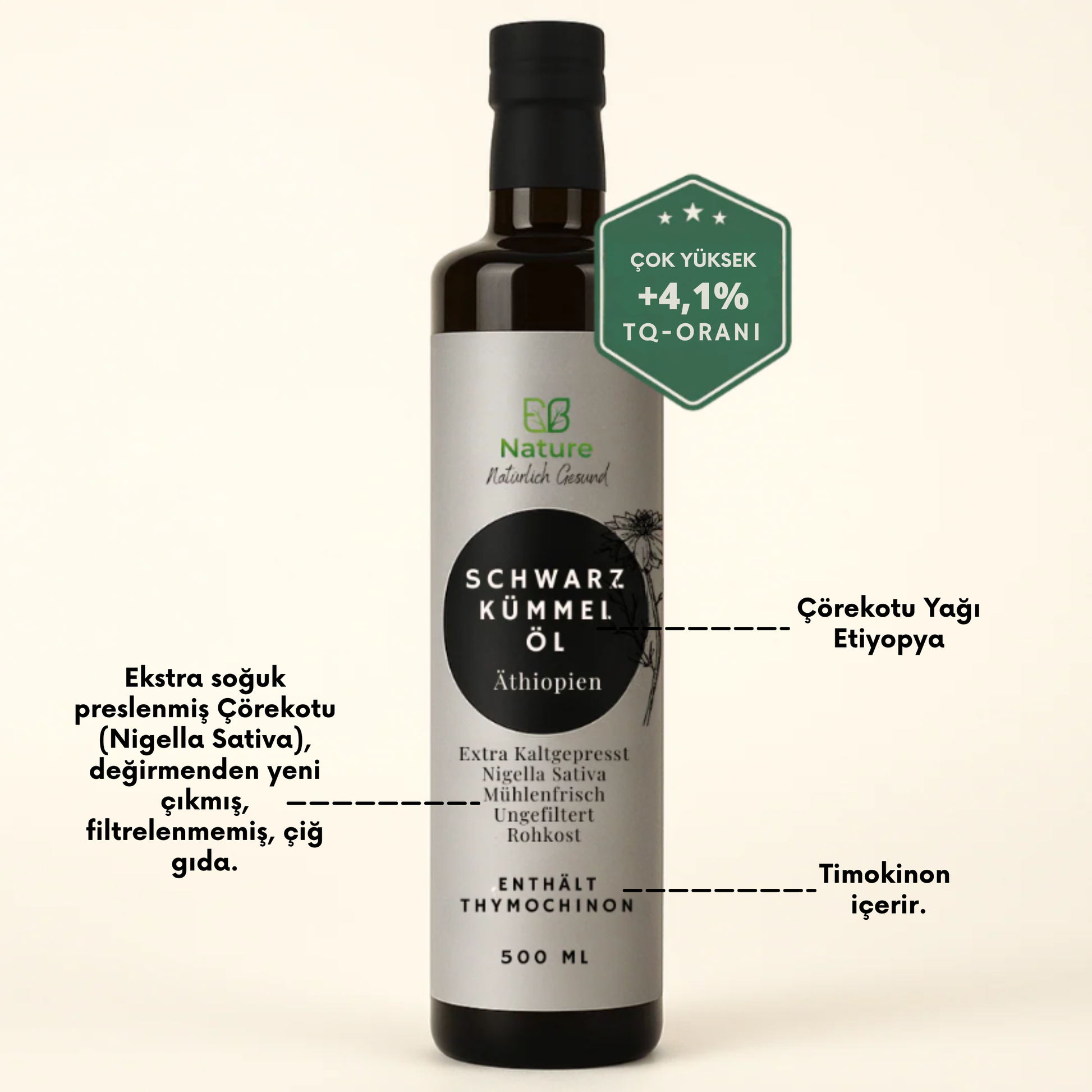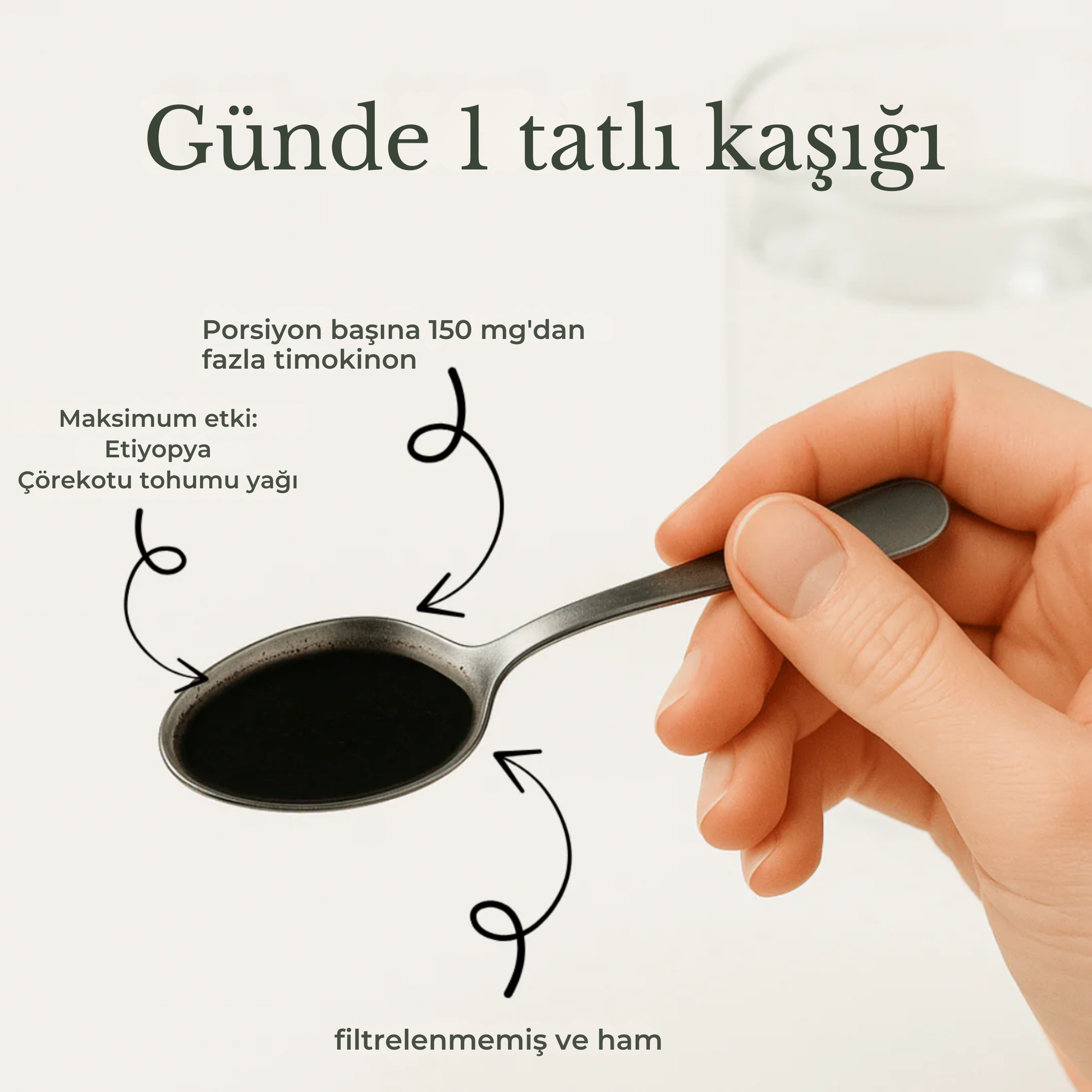 En kaliteli Etiyopya Çörekotu tohumlarından elde edilen en saf Çörekotu yağı. Filtresiz, soğuk preslenmiş ve tamamen doğal – yoğun lezzet ve maksimum besin çeşitliliği için.